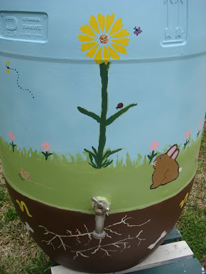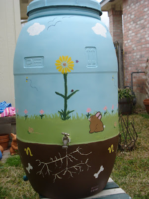 Well, it's finally finished! I painted our rain barrel and, though it isn't great art, I had a great time with this project. I'm looking around for other things to paint--Mark's volunteered the metal trash cans in the yard, so I'm thinking about design options. We also have some yard gnomes (all grey) that need some sprucing up, so they're on the list too! (Chris, I'm taking your advice and staying away from Uncle Mark's truck--much to his relief!)